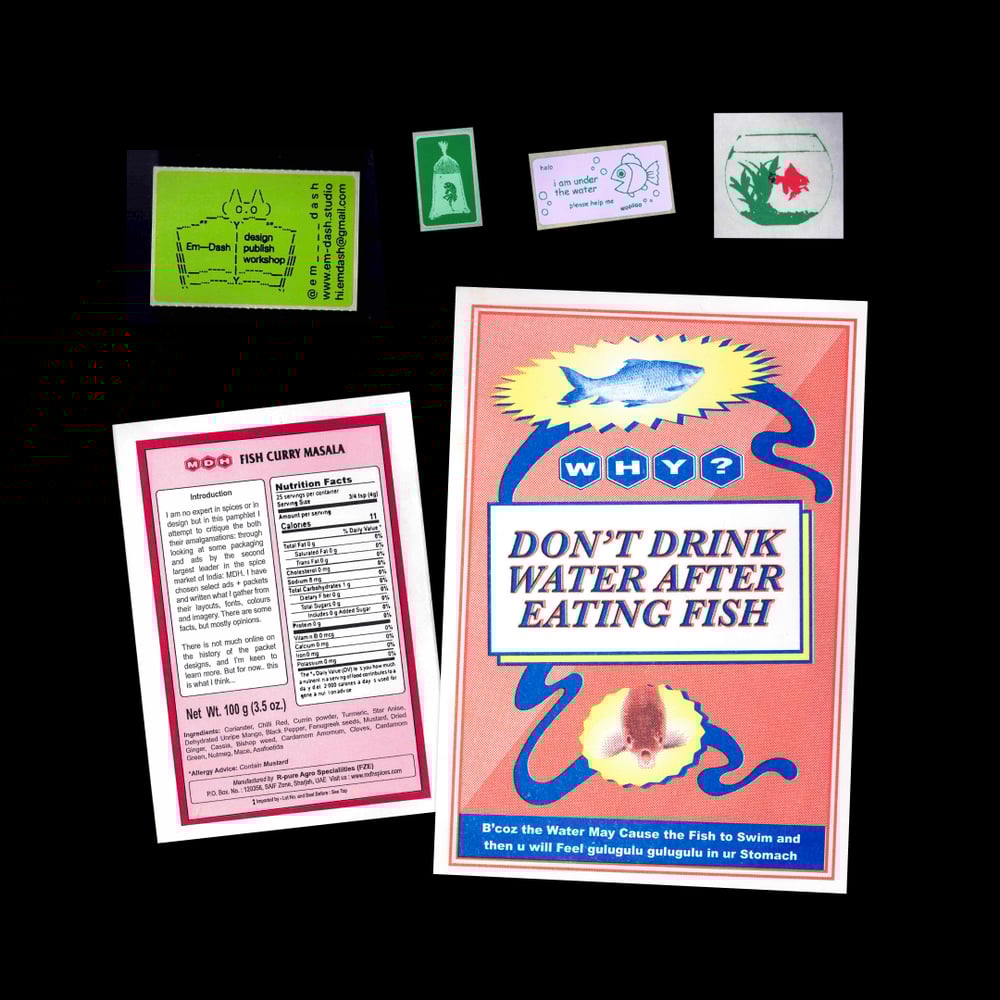 A RISO print combining the cultural reset meme of Indian Twitter: Don't Drink Water After Eating Fish and packaging design of MDH Deggi Mirch.
